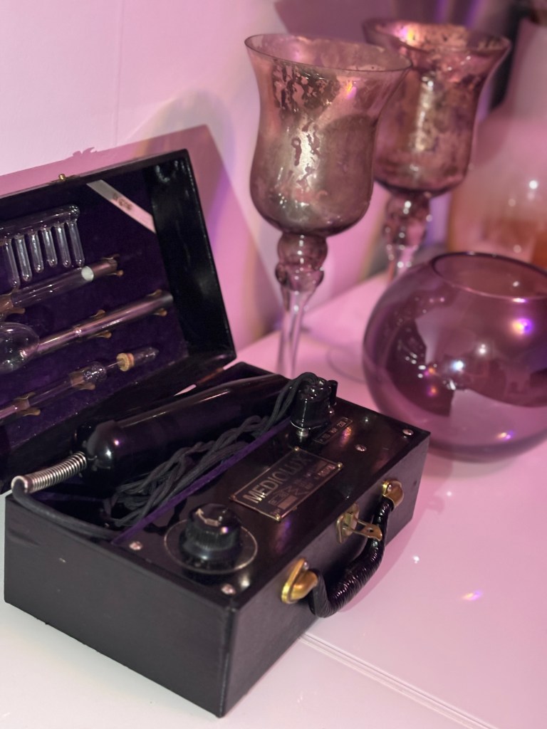 En av mina slavar har nu budat hem och renoverat upp egen högfrekvensapparat åt mig. Som tack fick han premiärtesta och vara mitt försöksobjekt, det både sprakar och fräste fint mot hans bara hud, vilket ger mig rysningar av upphetsning. Känsligast var det vid hans lilla ynkliga mask och givetvis fokuserade jag extra mycket där med glasstaven. I mörker blixtrar det violetta vackra strömbågar mot hans hud som dansande el-ormar och jag kunde inte låta bli att tillfredställa mig själv med fingrar samtidigt som han vred sig i plågor och fick kämpa med andningen bakom sin gag…
