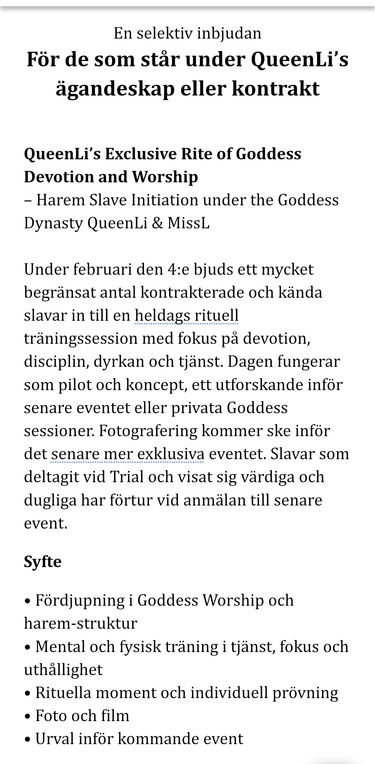 I februari startade detta med QueenLi’s Exclusive Rite of Goddess Devotion and Worship – Harem Slave Initiation, under Goddess Dynasty QueenLi & MissL.