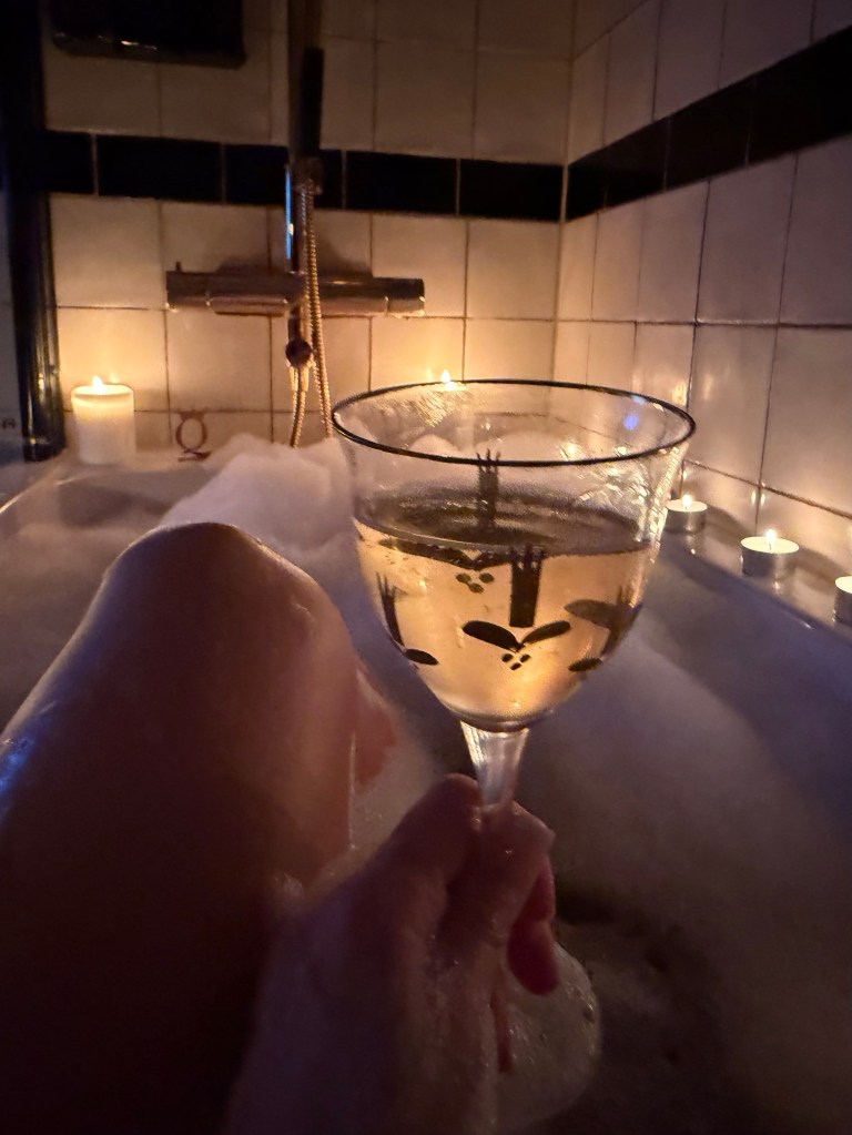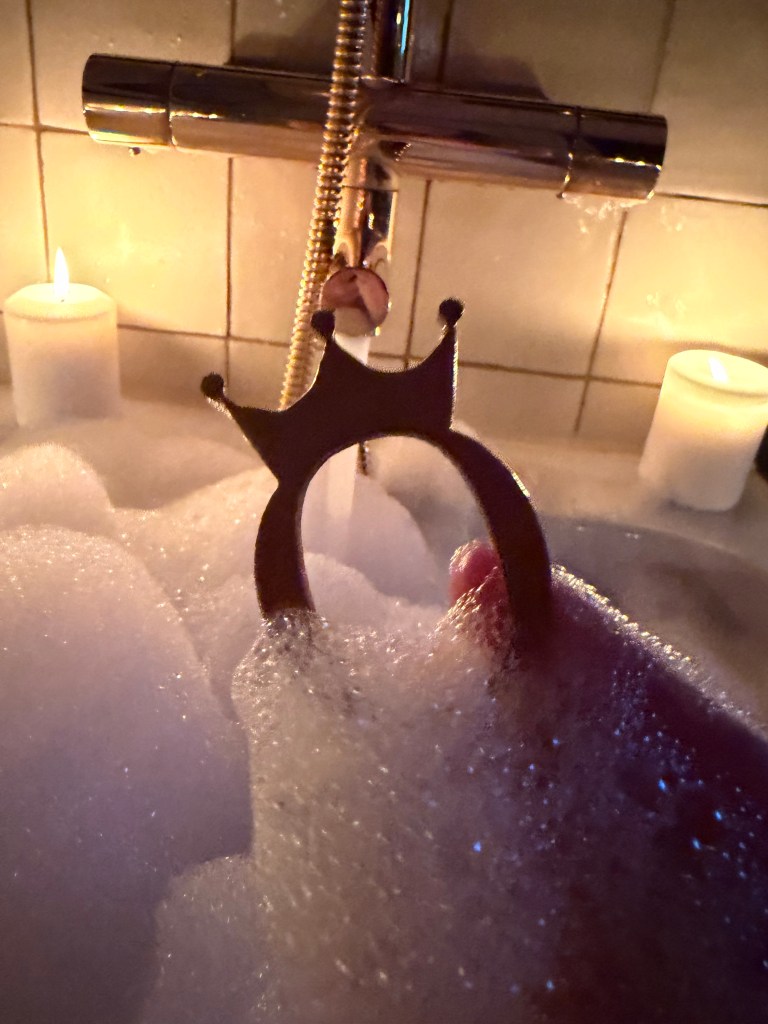 Stämningsfullt och mysigt ordnat. Ljus och musik, perfekt tempererat vatten och lite bubbel, skapar skön relax och återhämtning för Queen.